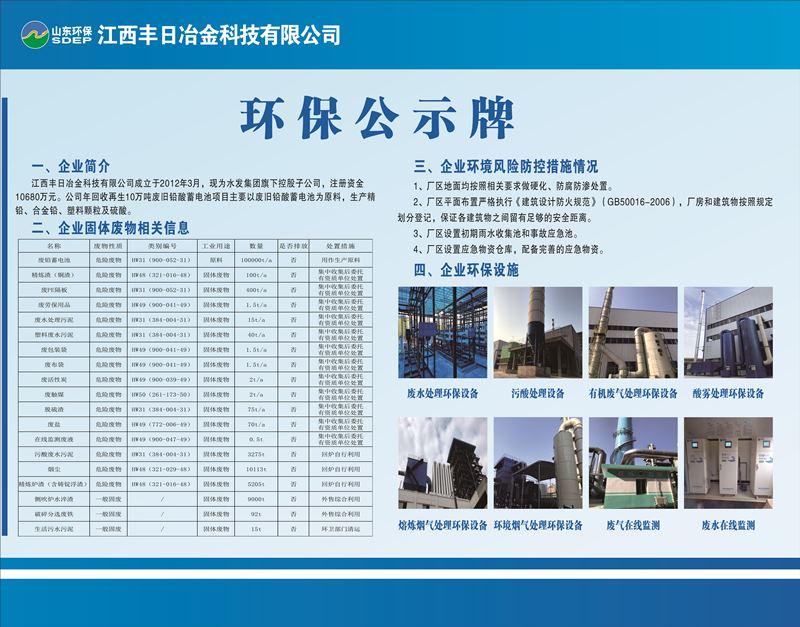 江西豐日冶金科技有限公司江西豐日冶金科技有限公司成立于2012年3月,注冊資金15000萬元,現為山東環(huán)保集團旗下控股子公司,落戶于江西省宜春市袁州醫(yī)藥工業(yè)園。公司年回收再生十萬噸廢舊鉛酸蓄電池項目占地62.41畝,總建筑面積42180㎡,總投資3.5億元,于2020年5月份投入生產,自生產以來運行穩(wěn)定,年產值達10億元以上,年納稅1億元以上。
